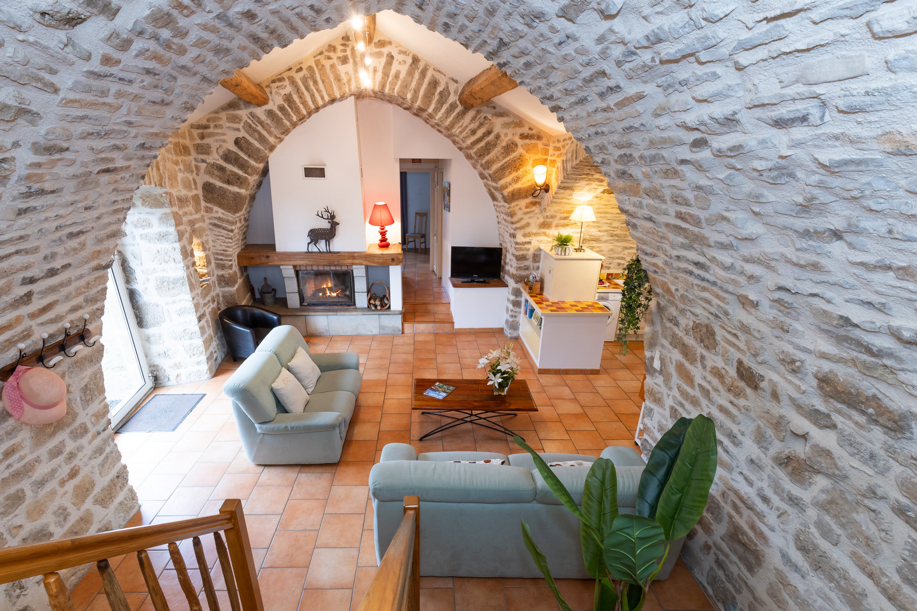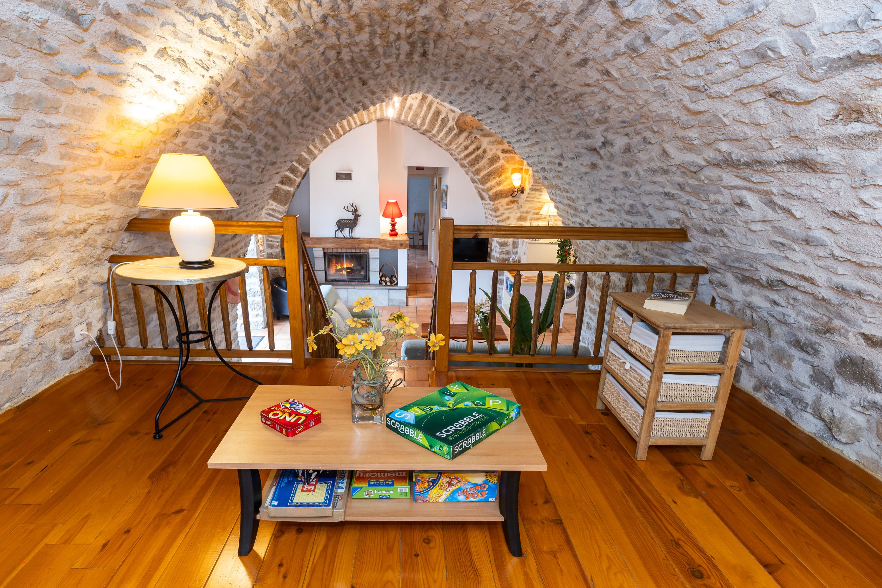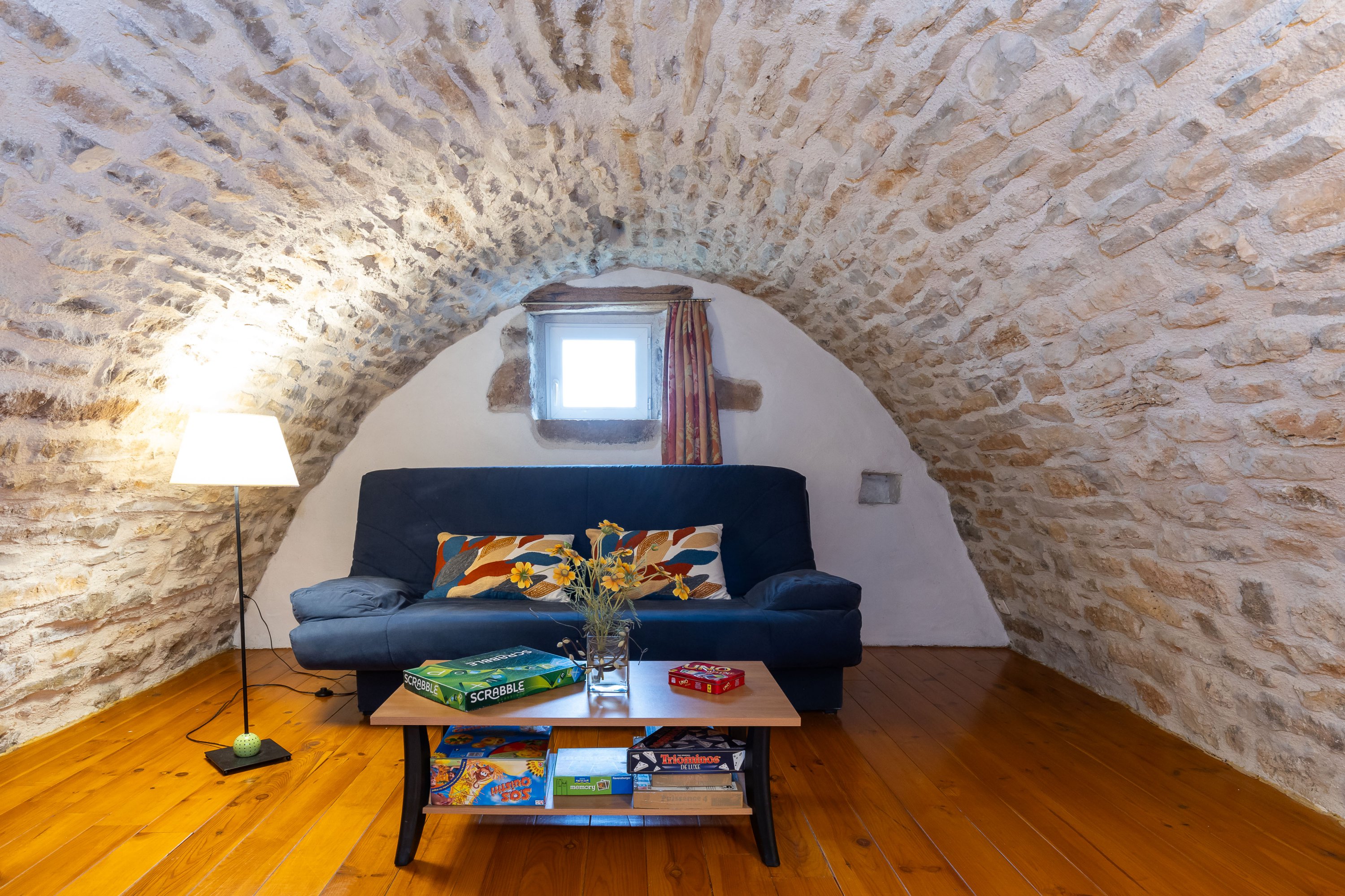 Vous trouverez un salon avec 2 canapés, cheminée avec insert ainsi qu’une mezzanine avec canapé clic-clac 140 cm ; une belle cuisine intégrée dans pièce voûtée avec four traditionnel, micro-ondes, lave-vaisselle, lave-linge, cafetière à dosettes Senseo, congélateur, bouilloire, grille pain…